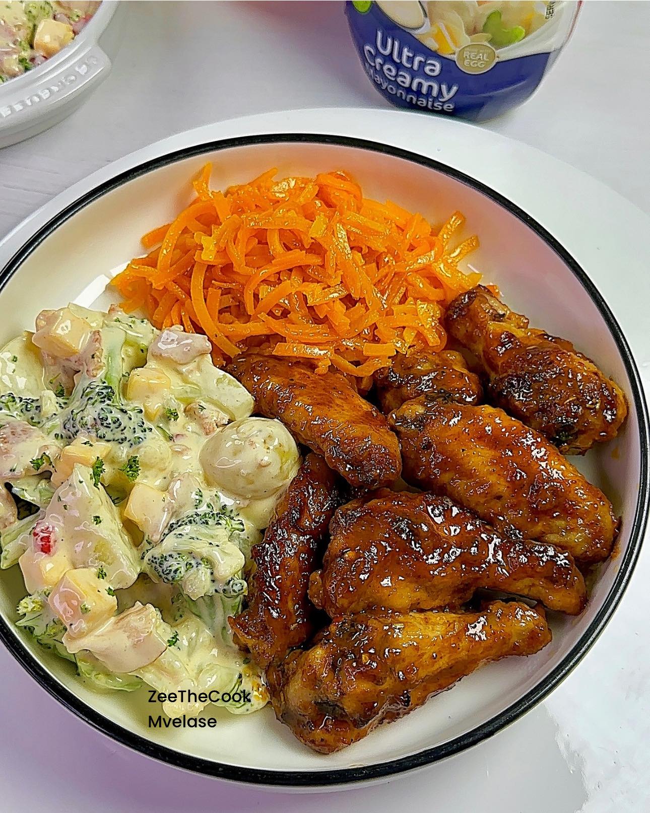 This dish works perfectly as a casual dinner, game-day spread, or weekend comfort meal. The contrast between the hot, sticky wings and the cool, creamy salad makes every bite balanced and irresistible.