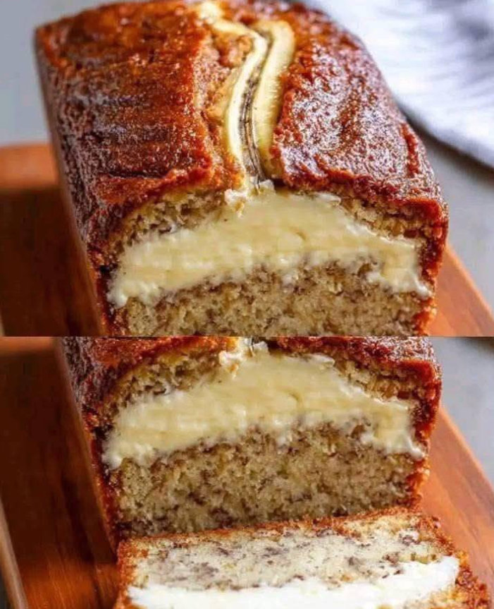 Banana bread filled with cream cheese is a soft banana bread, with a melting cream cheese heart. This recipe requires 15 minutes of preparation and 65 minutes of baking, for a standard loaf (about 10 servings). The layer of cream cheese creates a nice marbling when cut.