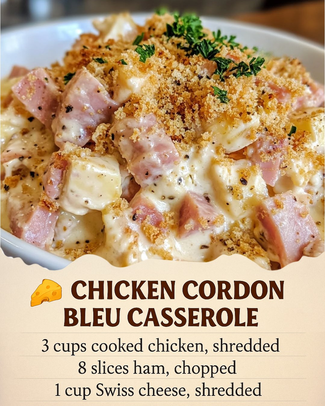 This Chicken Cordon Bleu Casserole is a delicious, family-friendly twist on the classic dish—without all the breading and rolling! Featuring layers of shredded chicken, savory ham, melty Swiss cheese, and a creamy Dijon-infused sauce, it’s topped with buttery breadcrumbs for a crispy finish. Easy to prep and ultra comforting, this casserole makes a perfect weeknight dinner or holiday side.