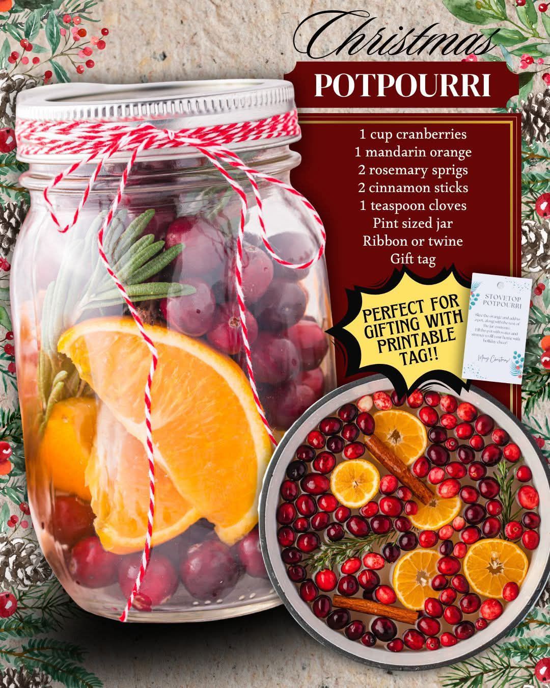 This Christmas Potpourri jar is a festive, aromatic blend designed to fill any home with warm holiday cheer. Fresh citrus, bright cranberries, herbal rosemary, and classic winter spices layer beautifully in a glass jar, making it both a thoughtful gift and a charming decorative piece. The combination looks striking through the jar, and once simmered, the aroma transforms the entire home with comforting, nostalgic Christmas scents. Simple assembly and natural ingredients make this a wonderful handmade gift for neighbors, hosts, teachers, or anyone who loves the magic of the season.
