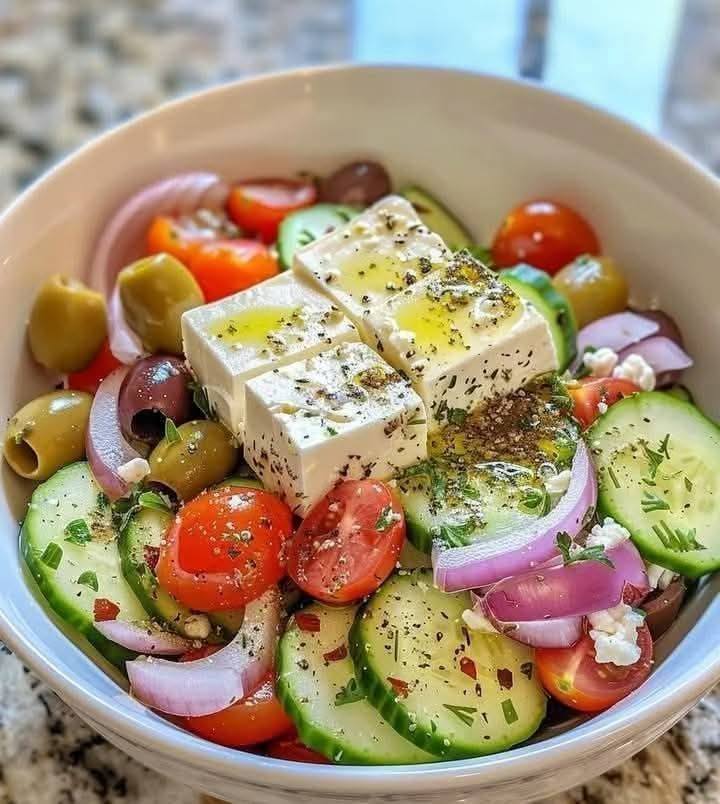 This classic Greek Salad is fresh, vibrant, and bursting with Mediterranean flavor. Crisp cucumbers, juicy cherry tomatoes, thinly sliced red onions, and briny olives come together in a simple yet beautifully balanced combination. Finished with creamy feta cheese, fragrant dried oregano, and a generous drizzle of olive oil, this salad celebrates fresh ingredients in their purest form.