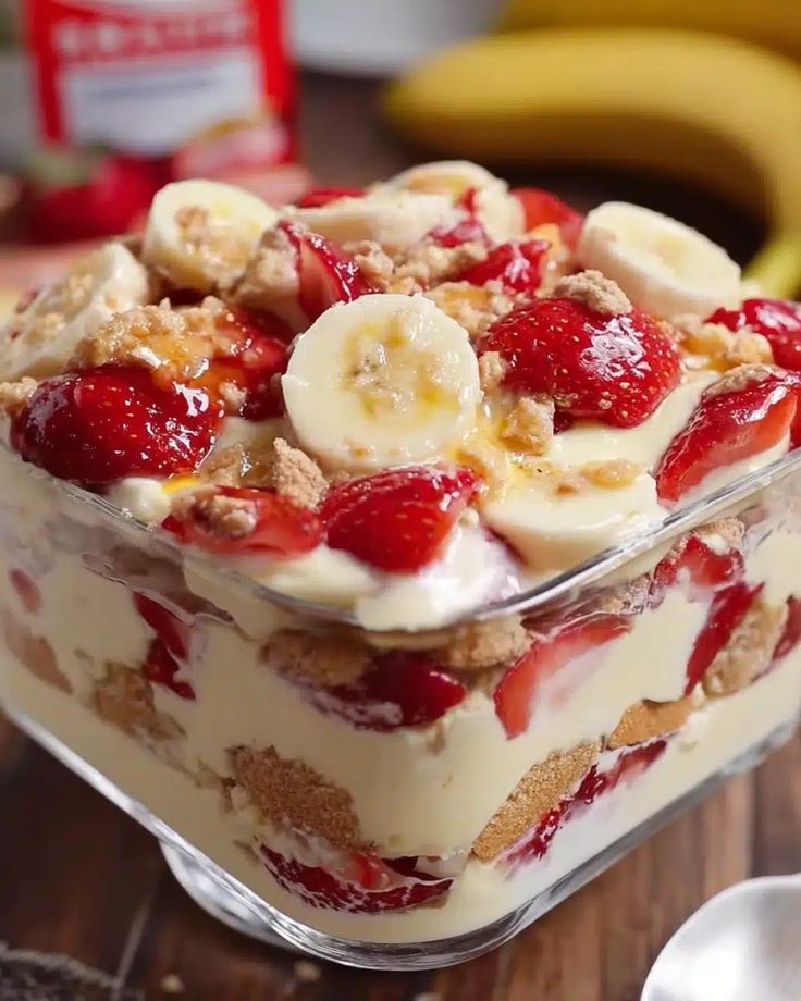 This delightful Easy No-Bake  Strawberry Banana  Custard Trifle  brings together layers of  creamy vanilla custard, fresh juicy strawberries, sweet sliced bananas, and a hint of crunchy biscuit crumb. It’s a simple, elegant dessert that’s perfect for any occasion, offering a symphony of textures and flavors in every spoonful. You’ll love how effortlessly this comes together, leaving you more time to savor its delectable taste!