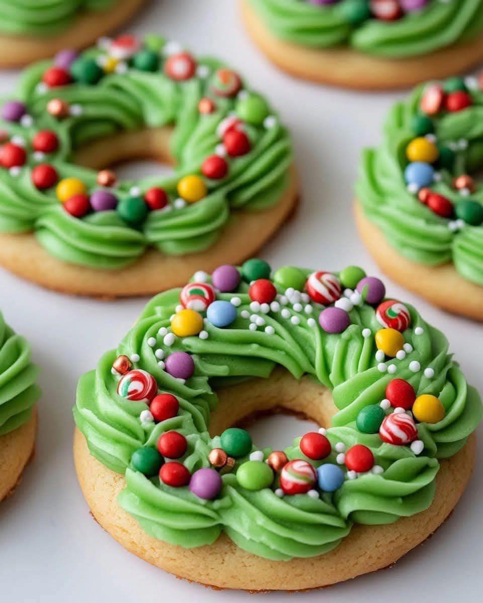 These Christmas Wreath Cookies are as joyful to make as they are to serve. Crisp-edged sugar cookies form the perfect base for fluffy green buttercream, piped into beautiful wreath shapes and finished with colorful candies that sparkle like holiday ornaments. They’re a show-stopping addition to cookie trays, dessert tables, and holiday gift boxes, and they instantly bring Christmas cheer to any gathering.