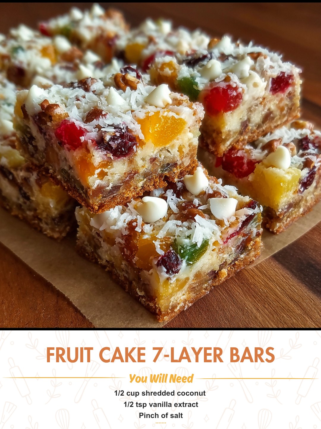 Fruit Cake 7-Layer Bars are a delightful treat that combine the flavors of a traditional fruit cake with the texture of a delicious layered bar. With a rich combination of ingredients, these bars offer a perfect balance of sweetness, texture, and flavor. The layers of coconut, vanilla, and a touch of salt create a mouthwatering treat that is both satisfying and comforting. These bars are perfect for holiday celebrations, family gatherings, or any occasion when you want a special dessert that everyone will enjoy. Read on to learn how to make this scrumptious dessert!
