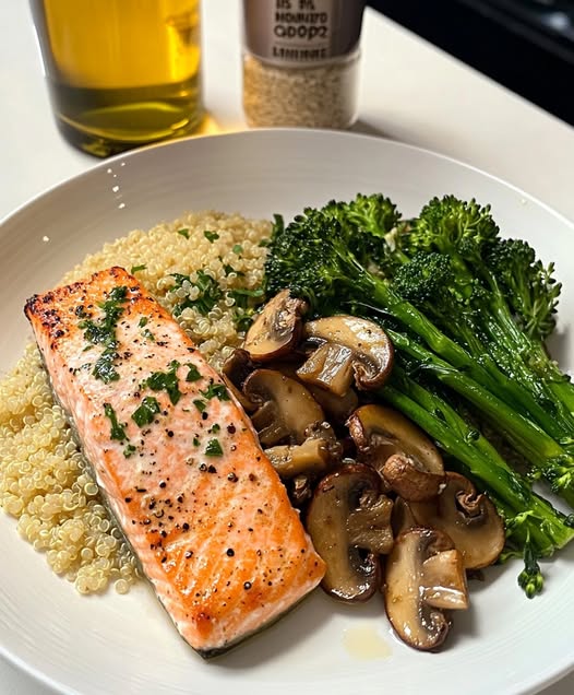 This Garlic Butter Salmon with Quinoa, Mushrooms, and Broccolini is a simple yet elegant dish that’s both nourishing and full of flavor. The flaky salmon is pan-seared to golden perfection, paired with umami-rich mushrooms sautéed in garlic, nutty quinoa, and vibrant green broccolini. Finished with a touch of lemon, this restaurant-worthy meal is ready in just 30 minutes and satisfies without weighing you down.