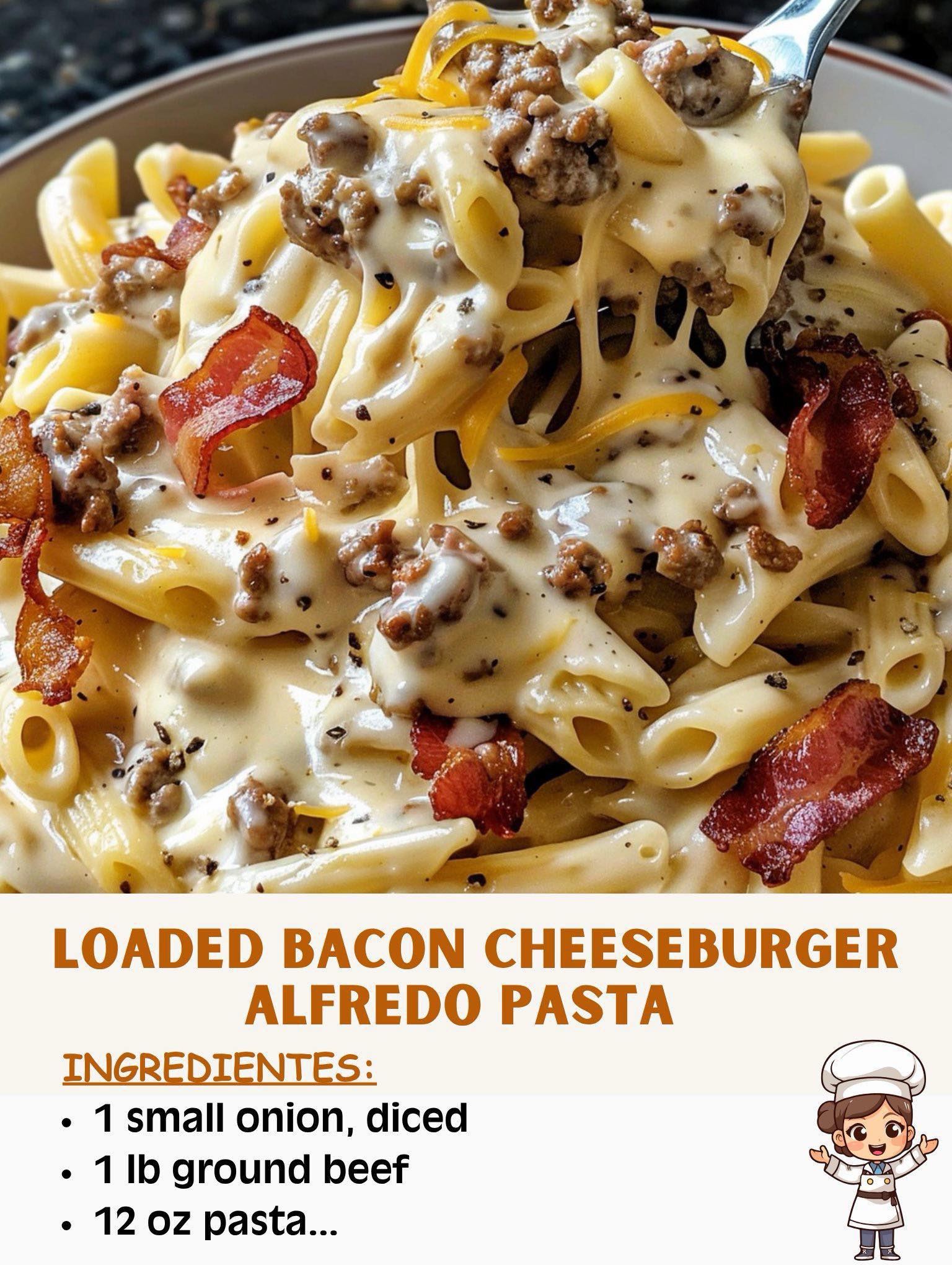 🍔🧀 A creamy, cheesy, and irresistibly rich dish — this Loaded Bacon Cheeseburger Alfredo Pasta combines the comfort of classic Alfredo with all the savory goodness of a loaded cheeseburger! With crispy bacon, seasoned ground beef, and a luscious cheddar-Parmesan cream sauce, every bite is hearty, indulgent, and absolutely delicious. 🍝🥓