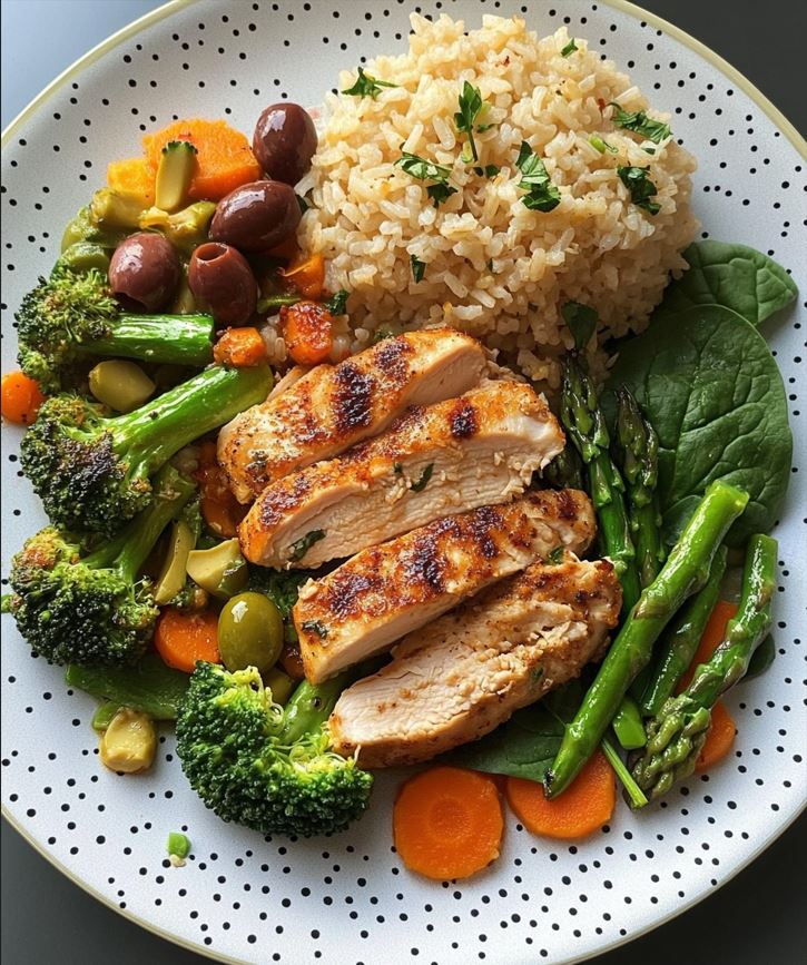 This vibrant, wholesome plate brings together juicy pan-seared chicken, tender-crisp veggies, seasoned fluffy rice, and fresh Mediterranean flavors. With olives, mustard, and optional lemon, it’s a clean, balanced dish that’s as satisfying as it is colorful—perfect for a quick and nourishing lunch or dinner.