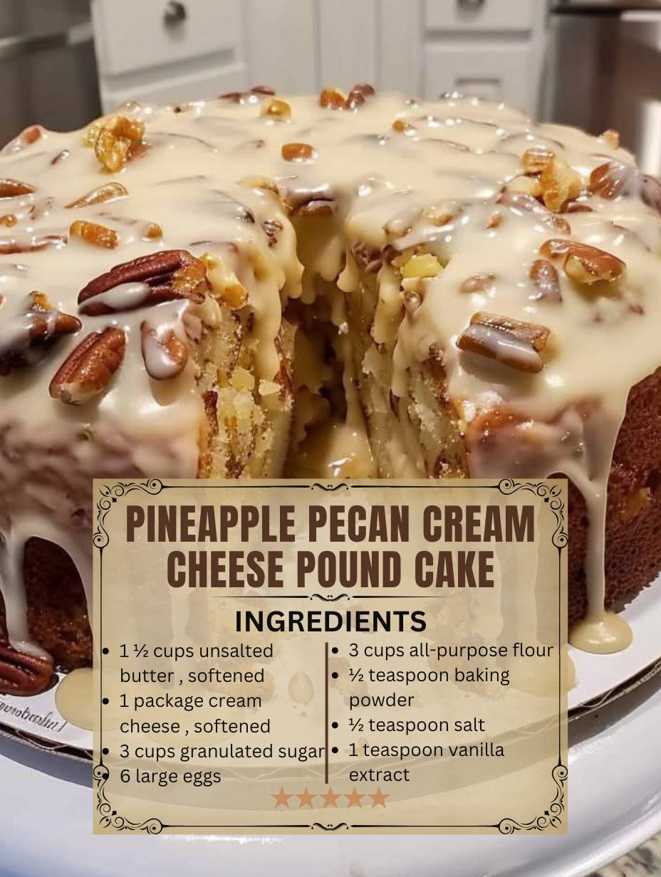 This Pineapple Pecan Cream Cheese Pound Cake is a decadent and moist dessert that combines the richness of cream cheese with the tropical sweetness of crushed pineapple and the crunch of toasted pecans. Topped with a tangy pineapple glaze, this cake is perfect for holidays, potlucks, or any special occasion. It’s a delightful twist on the classic pound cake that’s sure to become a family favorite.