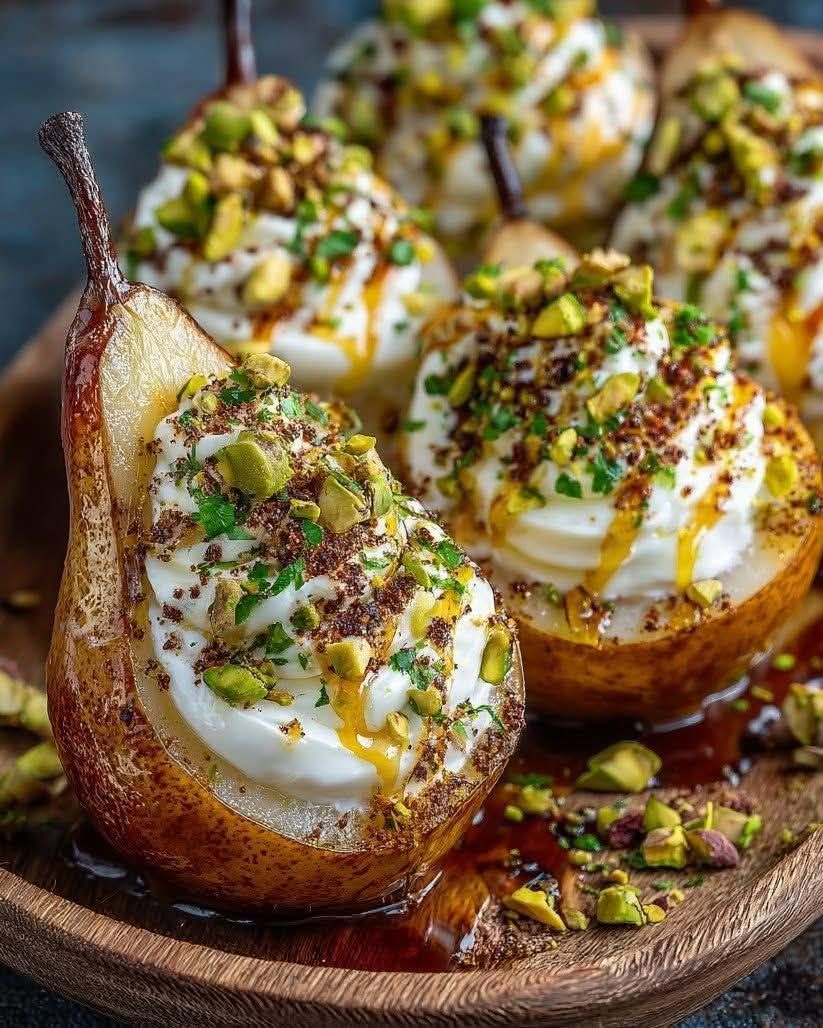 These Roasted Pears with Cream Cheese and Pistachios transform simple ingredients into an elegant dessert or brunch dish. Warm, caramelized pears serve as the base, made tender in the oven with melted butter, brown sugar, and cinnamon. Once cooled slightly, each pear is filled with creamy, softly sweetened cream cheese and finished with chopped pistachios for crunch. A drizzle of honey adds a glossy finish and enhances the natural fruit sweetness. The recipe comes together quickly, yet feels luxurious—perfect for entertaining or treating yourself to something special with minimal effort.