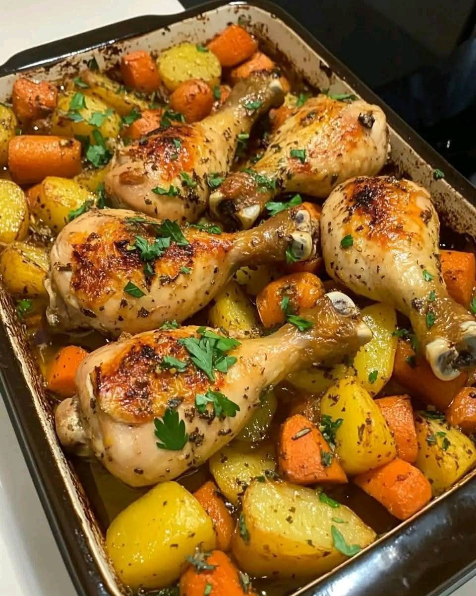 This Rustic Baked Chicken Drumsticks dish with Herbed Carrots and Potatoes is the definition of hearty, wholesome comfort food. Golden, seasoned chicken roasts atop a bed of aromatic vegetables that soak up all the savoury drippings—resulting in tender meat and caramelised, herb-kissed vegetables in every bite. With minimal prep and one baking dish, this meal is both satisfying and simple to make, ideal for cozy family dinners.
