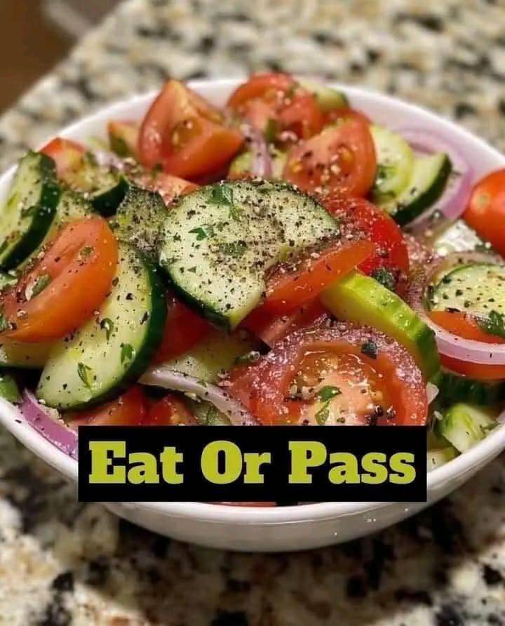 Two big cucumbers, thinly sliced; one big red onion, thinly sliced; three big tomatoes, sliced or wedges