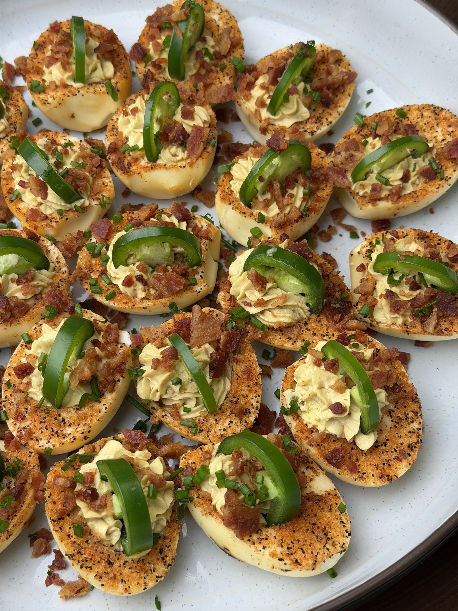 Smoked Jalapeño Popper Deviled Eggs are a bold, crowd-pleasing appetizer that takes classic deviled eggs to the next level. Creamy, smoky egg yolks are blended with tangy cream cheese, spicy pickled jalapeños, and savory seasoning, then piped back into gently smoked egg whites and finished with crispy bacon, fresh jalapeño slices, and chives. Every bite delivers heat, smoke, crunch, and richness—perfect for cookouts, game days, or backyard BBQ spreads.