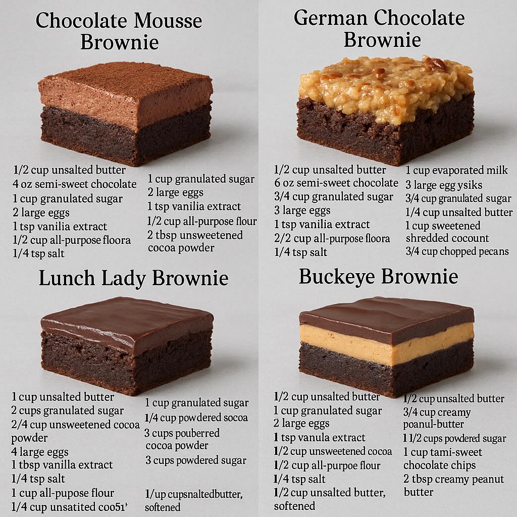 From fudgy layers and creamy toppings to nostalgic cafeteria classics and peanut butter bliss—this brownie lineup has something for every chocolate lover. Whether you’re hosting a party, baking for a potluck, or treating yourself to something decadent, each of these brownie variations is sure to satisfy!